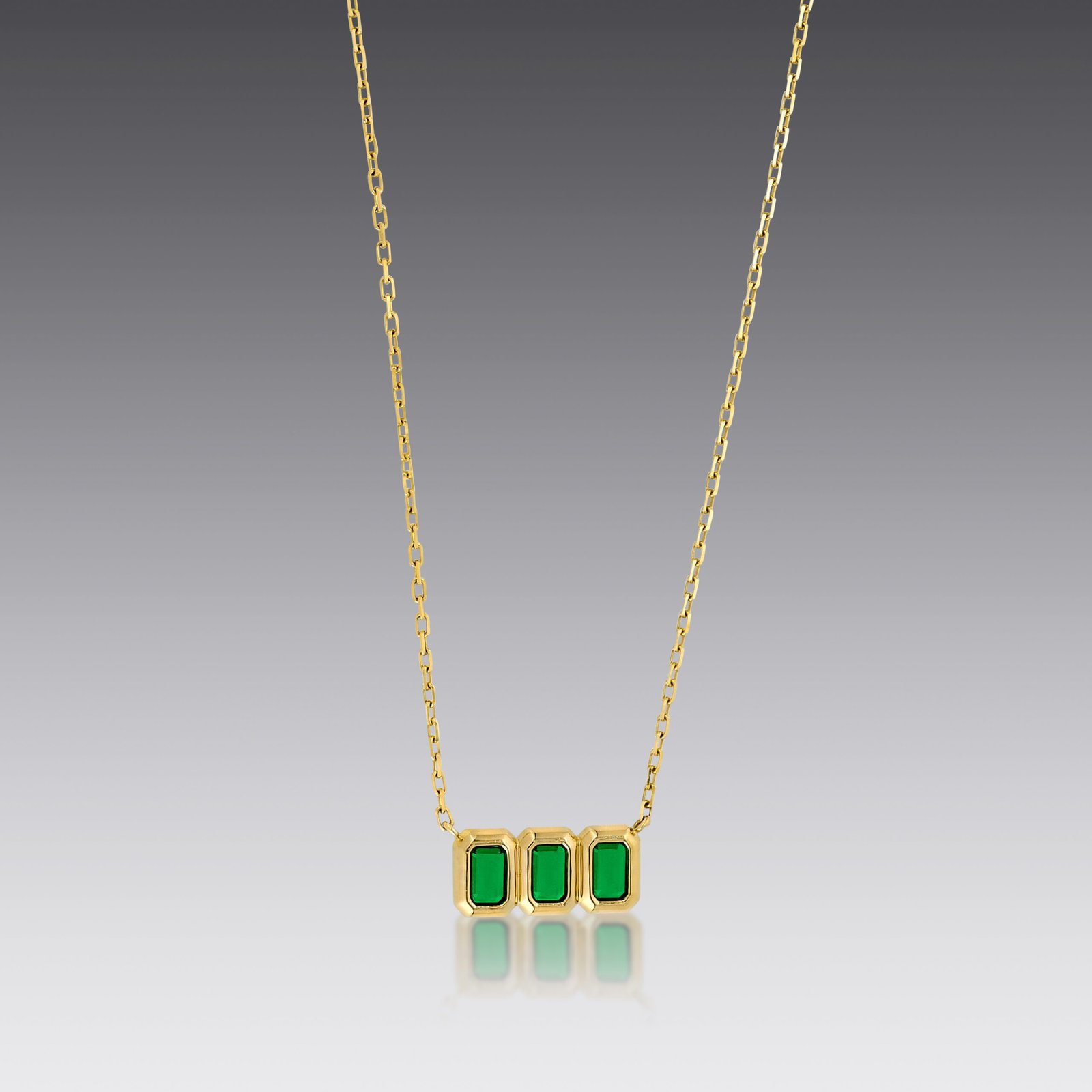 Side by side by side: three emerald cut Colombian emeralds are framed in 18kt yellow gold, giving this necklace a warm glow and soft finish.