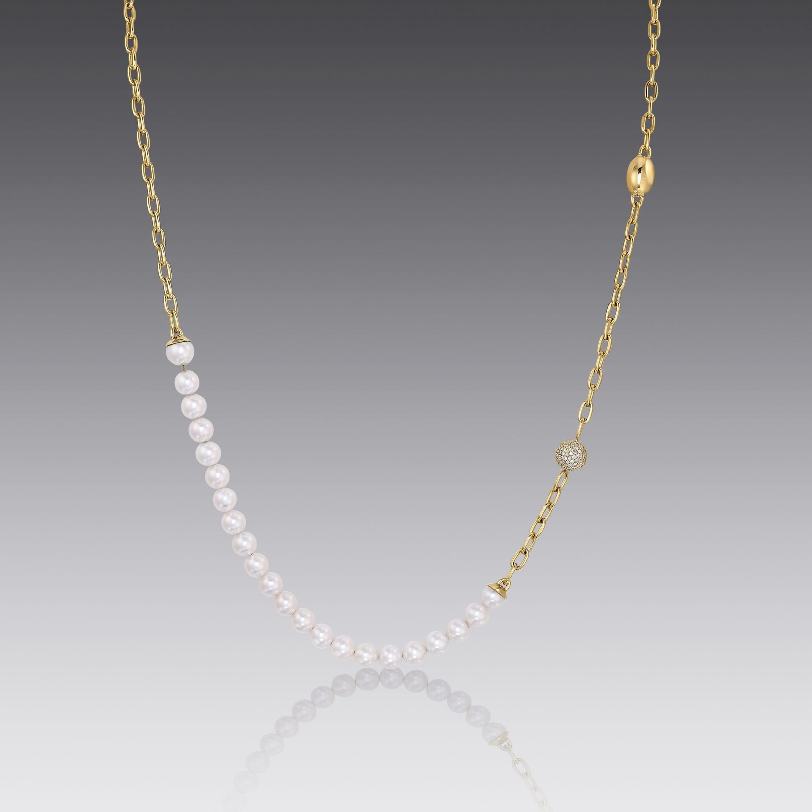This gorgeous, Gatsby-esque pearl necklace with yellow gold chain combines old-world flair with trendy details. White pearls stack up, across from a radiant diamond bead and oval gold bead. A textured 18kt yellow gold chain holds it all together. Layer with more delicate pieces, or let this one shine on its own.