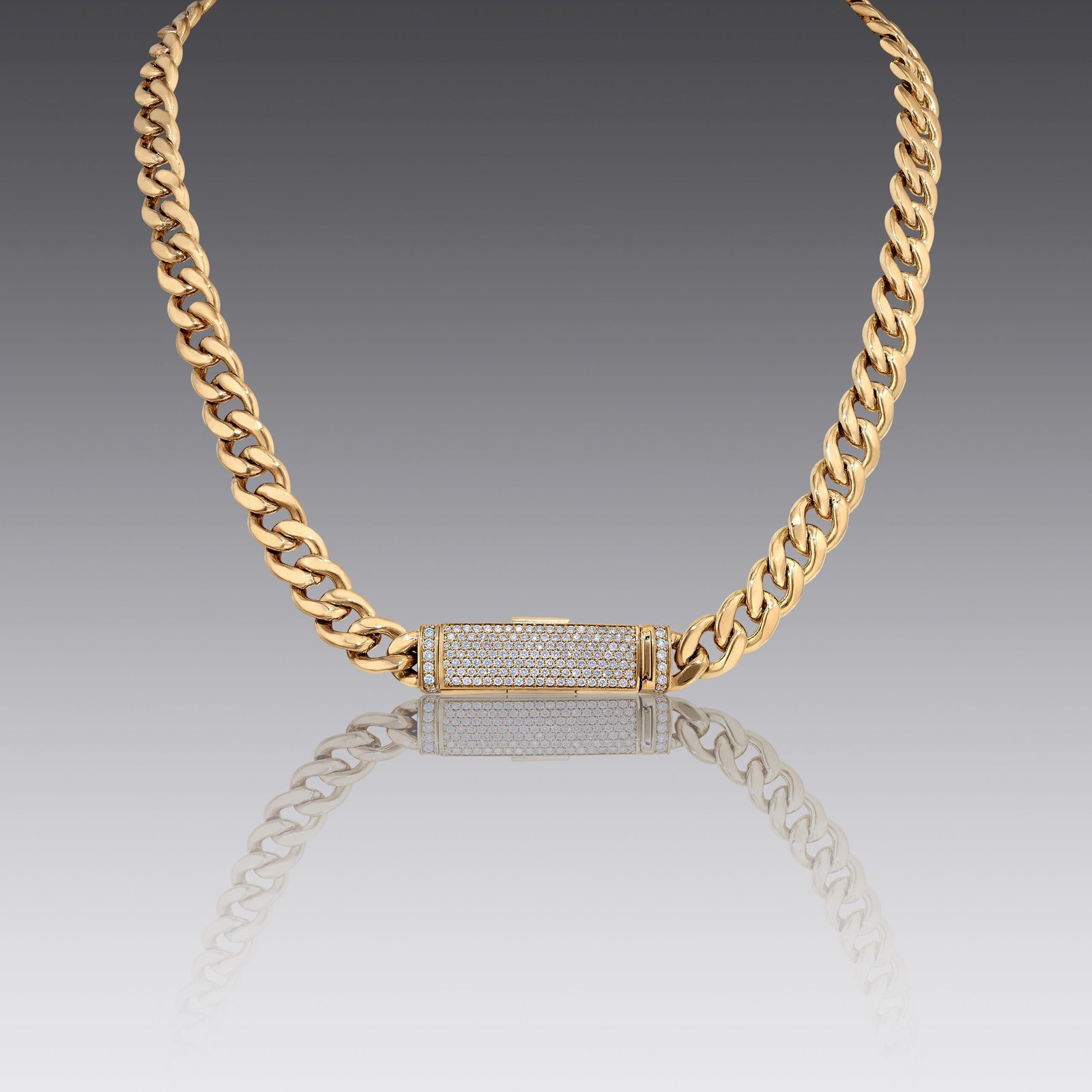 – 18kt yellow gold  – 1.77cttw VS  – 18″ handmade chain  – 37 mm x 10.5 mm x 5.45 mm clasp