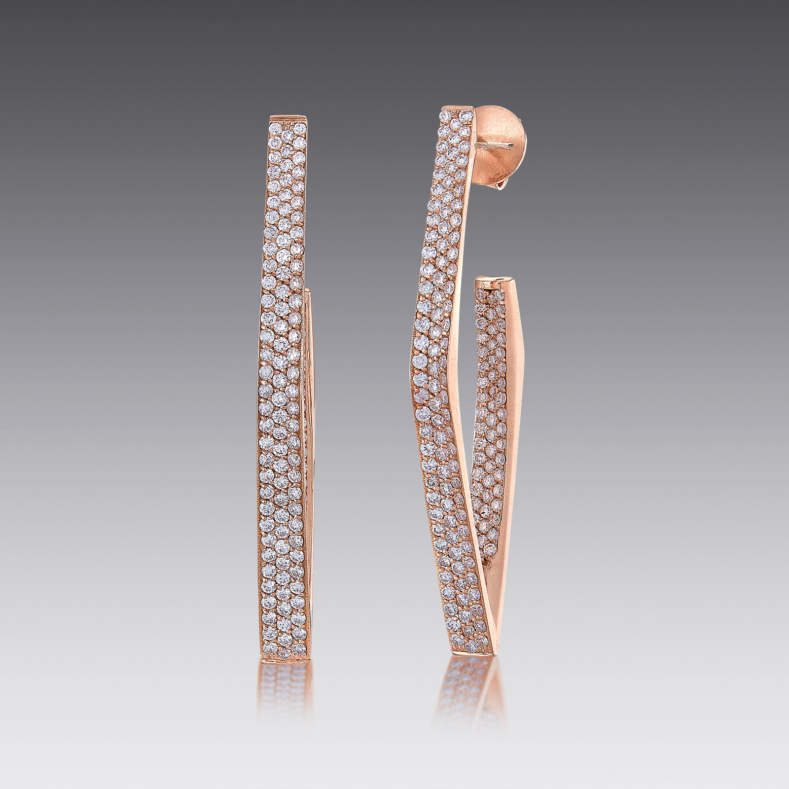 Give yoursef a sparkling edge with with the clean, simple lines of these geometric earrings lined with diamonds. Pair with other pieces from the Edge Geometric Collection to complete your look. – 18kt rose gold – 3.38cttw diamonds