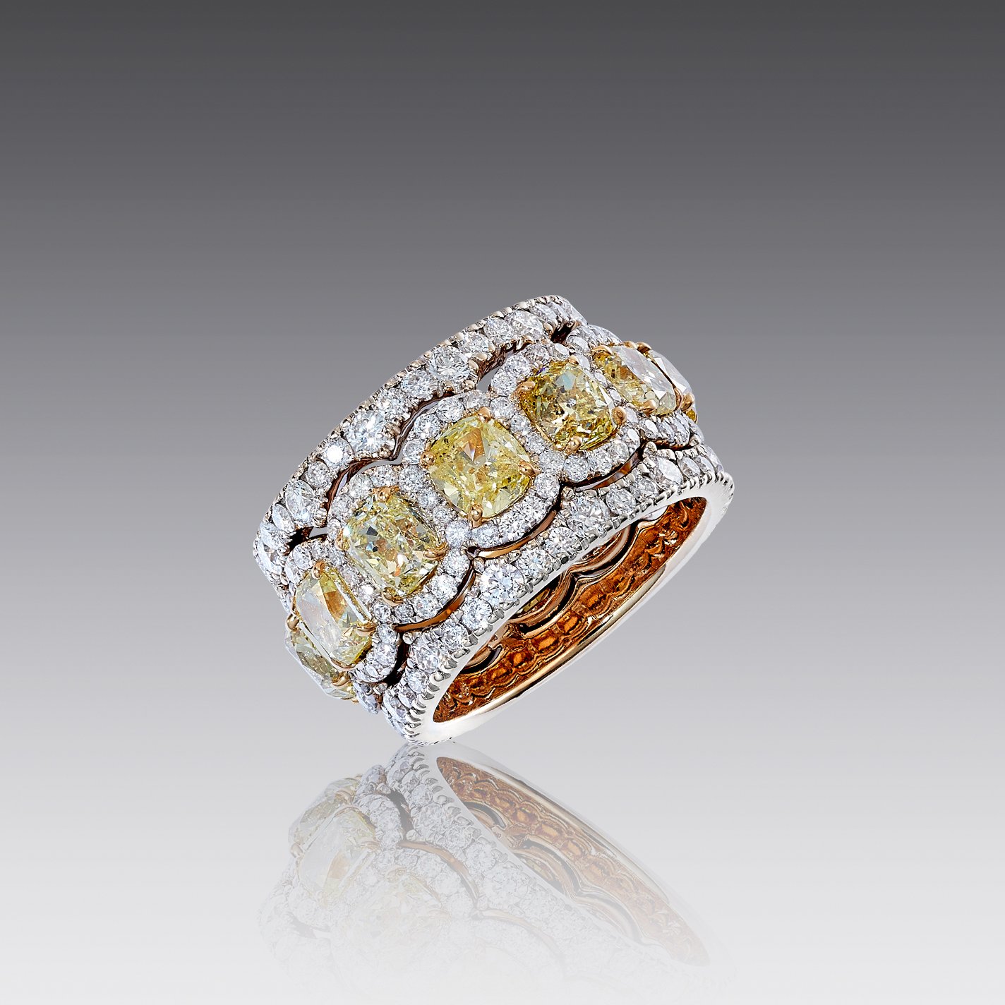 – 18kt white gold – 3.60cttw yellow fancy cushion diamonds – 1.08cttw white diamonds