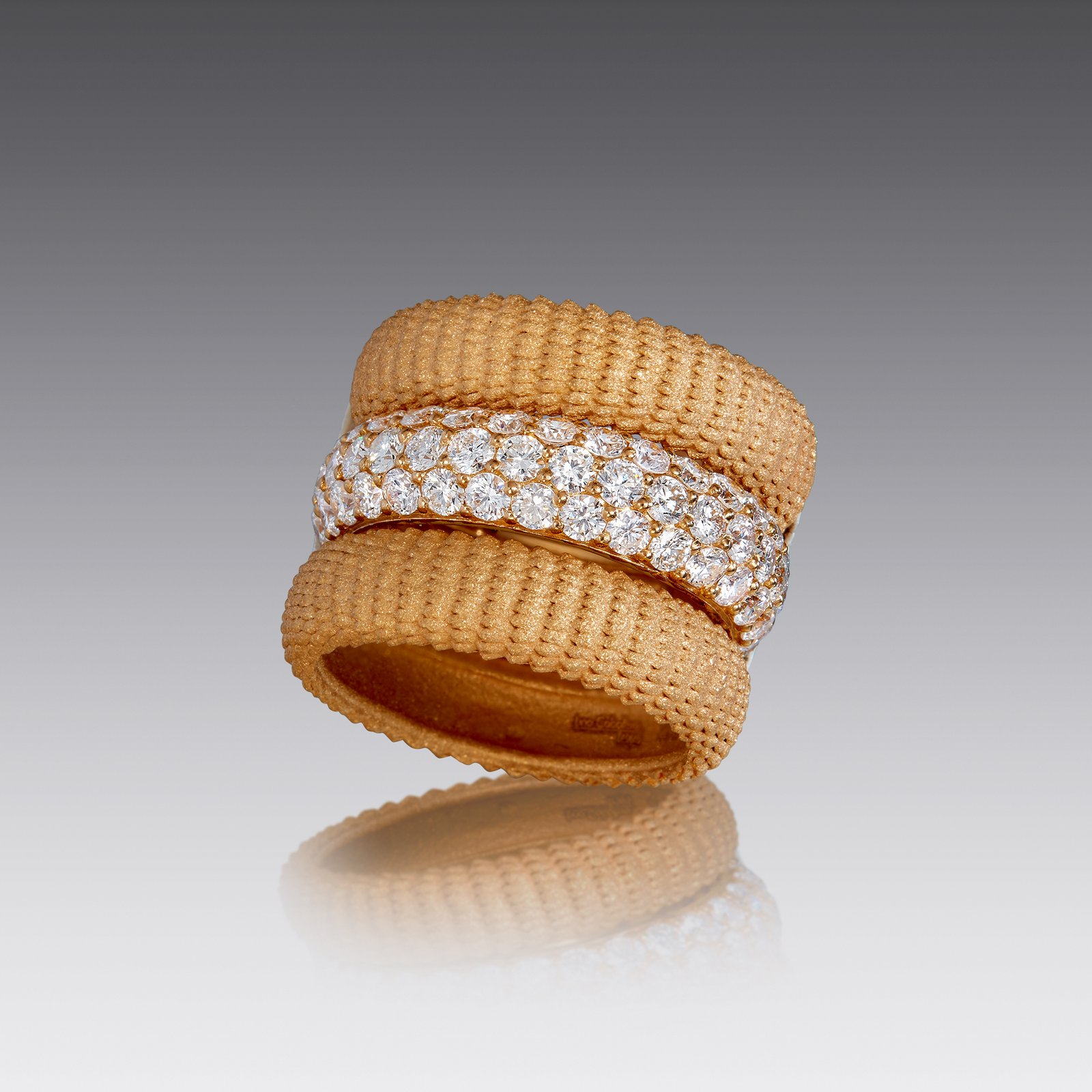 Round white diamonds and a warm golden glow combine to evoke a natural and sophisticated vibe. Style alone, or pair with the Shimmer Texture Ring to make a statement. – 18kt gold – 2.85cttw diamonds
