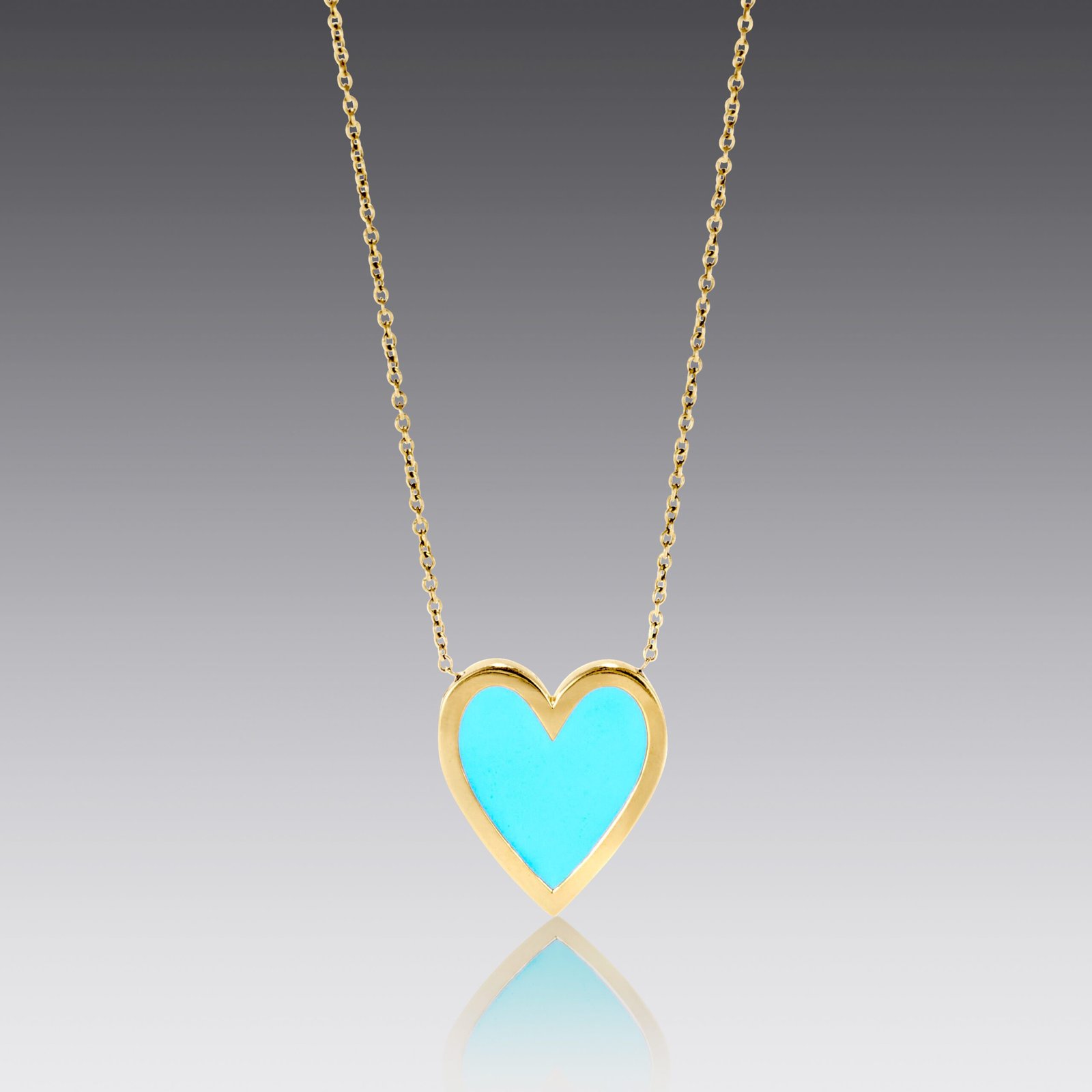 – 18kt yellow gold – Turquoise enamel – 13mm heart – 18” cable chain